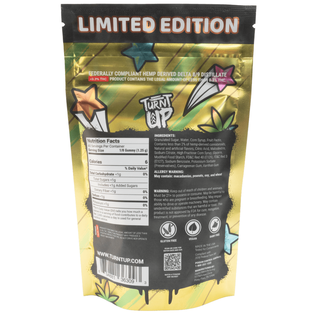 Turnt Up Limited Edition Gummies – Sour Red Berry are crafted with high-quality ingredients to provide a premium product that ensures a consistent and enjoyable experience.