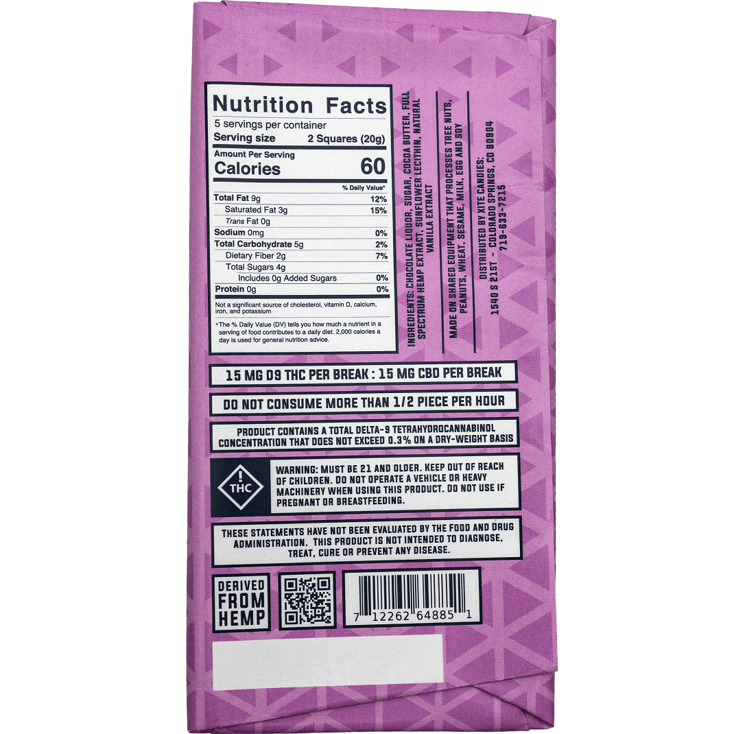 The Xite Delta 9 Dark Chocolate Bar delivers a rich and satisfying way to enjoy the benefits of Delta 9 THC and CBD. Made with over 64% cocoa, this bold dark chocolate is dairy-free and a great vegan option. Each bar contains 300mg total cannabinoids—150mg of Delta 9 THC and 150mg of CBD—split into 10 easy-to-break squares for consistent dosing. With 15mg of Delta 9 THC and 15mg of CBD per piece, the Xite Delta 9 Dark Chocolate Bar provides a mellow and happy experience that helps you relax, unwind, and feel good without going overboard. The Xite Delta 9 Dark Chocolate Bar is perfect for those who enjoy a bold chocolate flavor and a plant-based treat while taking the edge off.